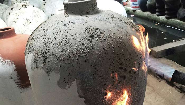 Når vasen har den ønskede form, skal den igennem en tørringsproces, hvorefter krukken brændes over åben ild. Malingen påføres, og en coating bliver skiftevis duppet på og nænsomt brændt i hånden med en gasflamme.