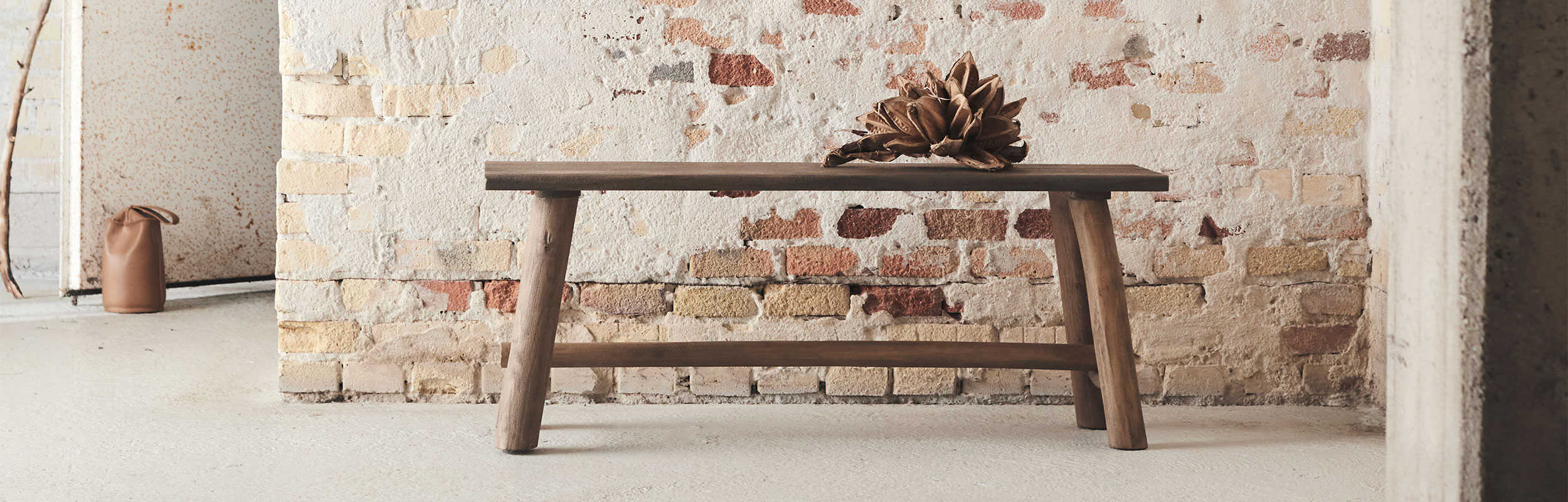 Benches and stools can also serve as decorative pieces themselves. The Raja bench, with its soft details and natural expression, is a work of art. Place it in the hallway as a focal point or in the bedroom as a decorative element.