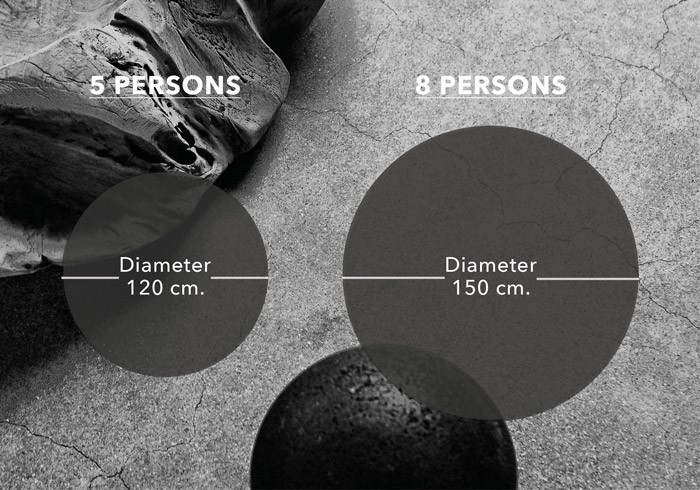 At MUUBS we recommend choosing a round dining table, which is between 120 cm and 150 cm in the diameter, as it will still be easy for everyone around the table to talk and reach the food etc. at the table.